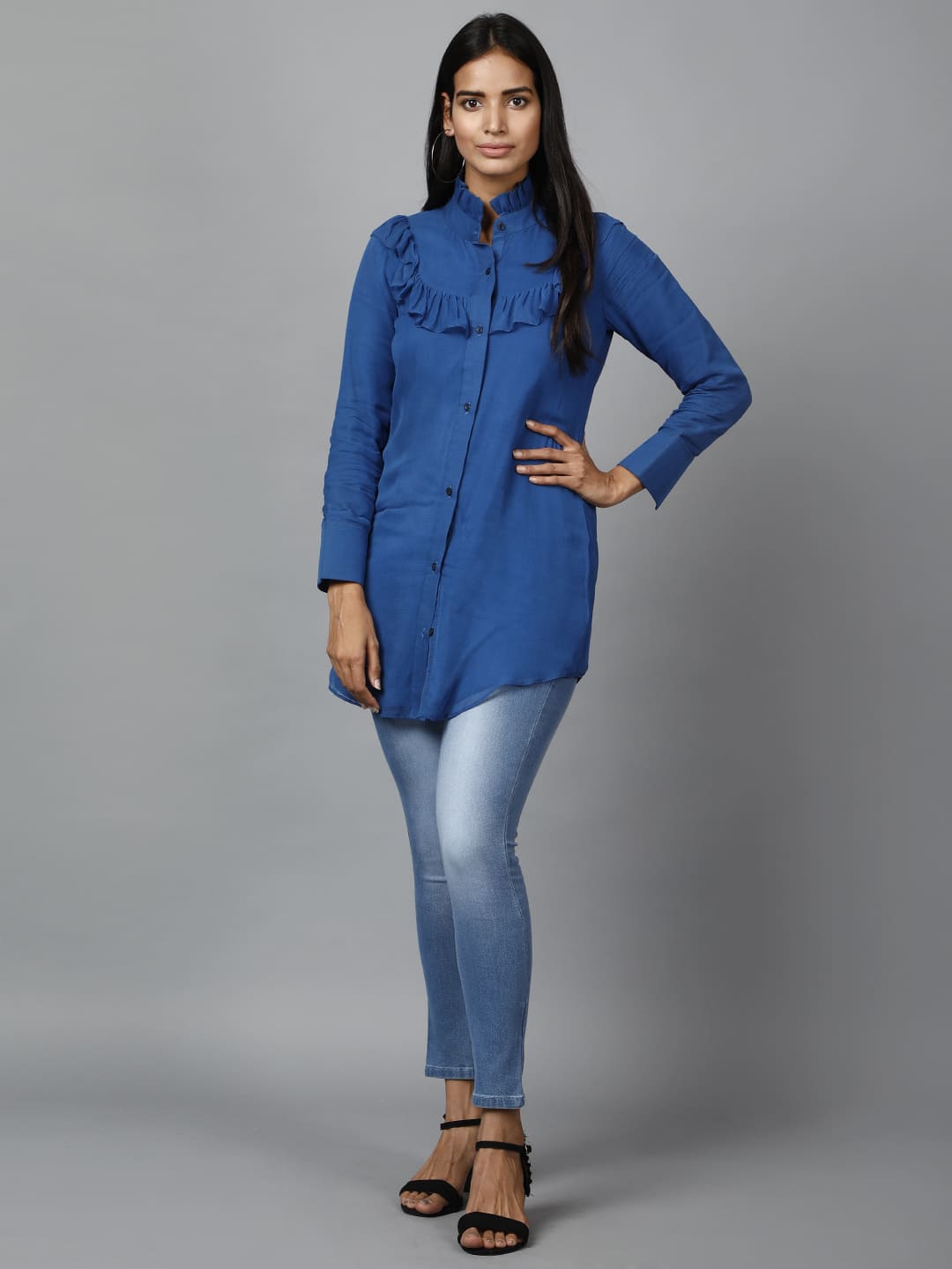 Corporate and Office Wear: Tuck your Cobalt Blue Ruffle Yoke Shirt into a pair of high-waisted charcoal trousers. The ruffled yoke adds a soft, feminine touch to a structured professional look.