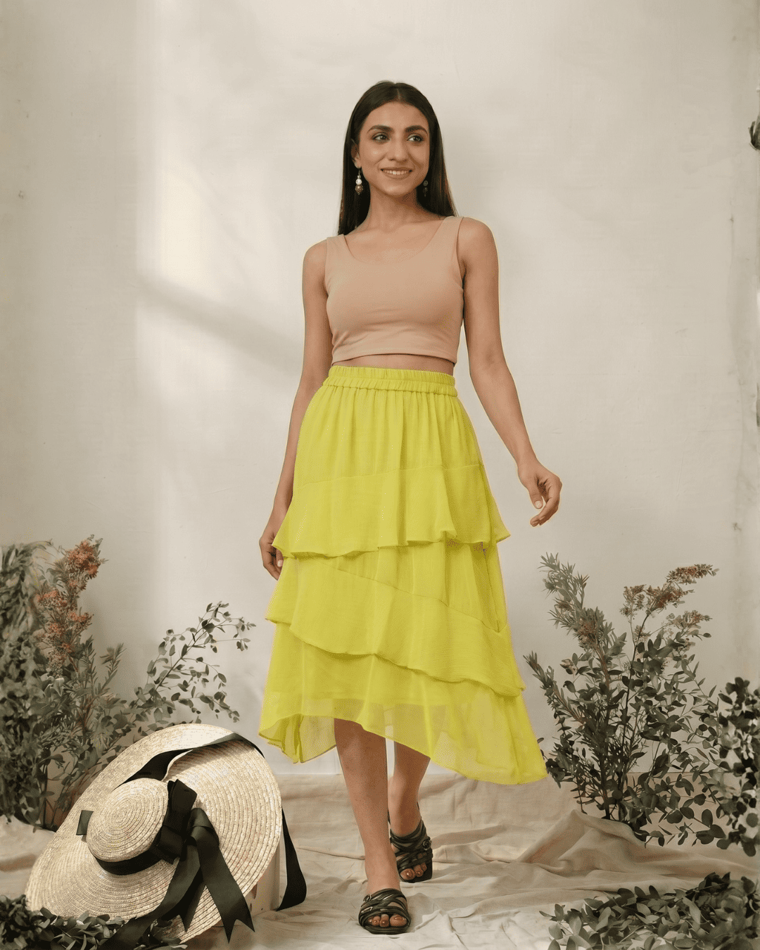Versatility is a core strength of the Lime Green Chiffon Ruffle Skirt. While the color is bold, it can be styled in several stunning ways to suit different dress codes: