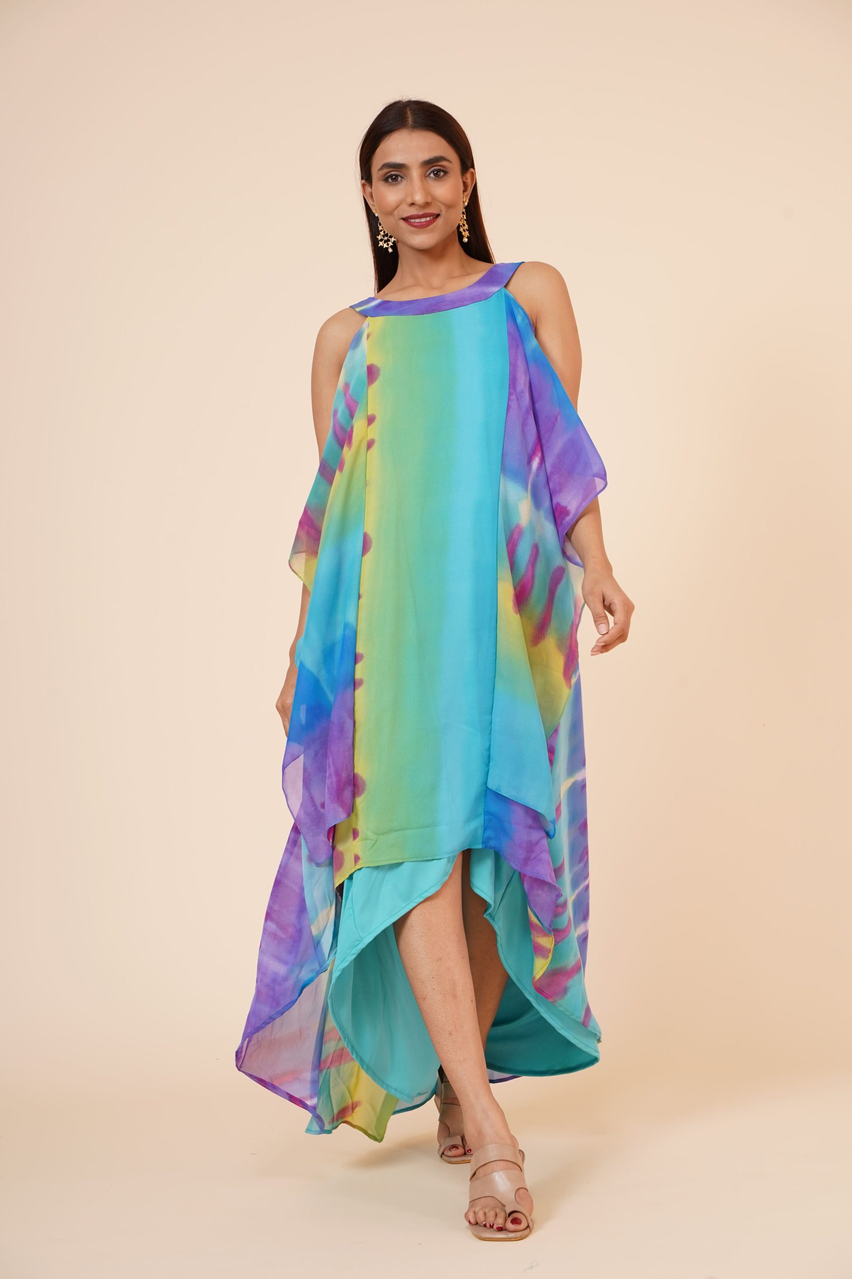 The Multicolor Printed Halter Neck Ruffle Drape Dress is the breath of fresh air your wardrobe has been waiting for. When it comes to making a lasting impression at a high-stakes event, few garments manage to balance sophistication with a playful spirit as effectively as this piece. Crafted from a premium blend of Georgette and Hosiery, this dress isn’t just a garment; it’s a confidence booster designed for the modern woman.