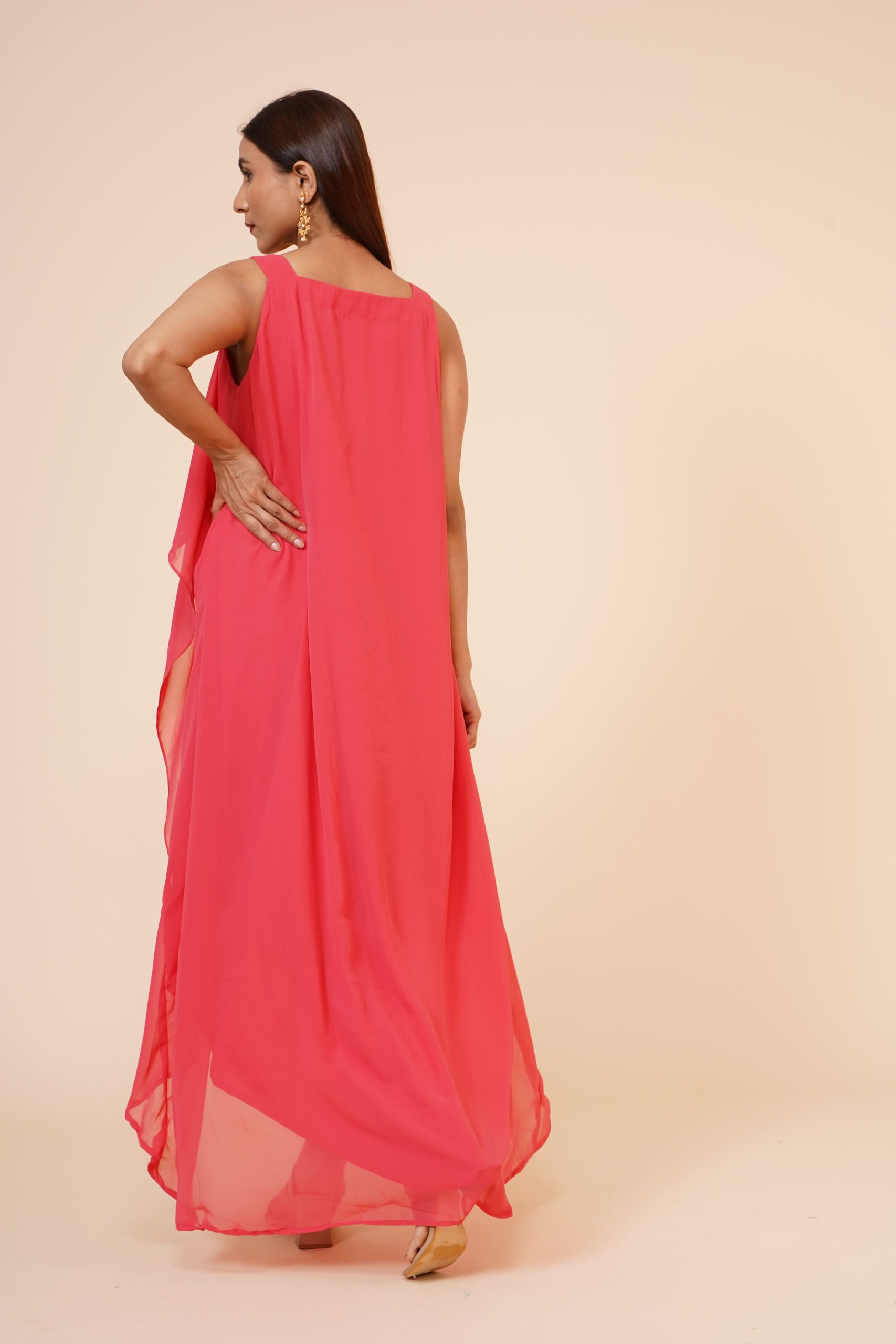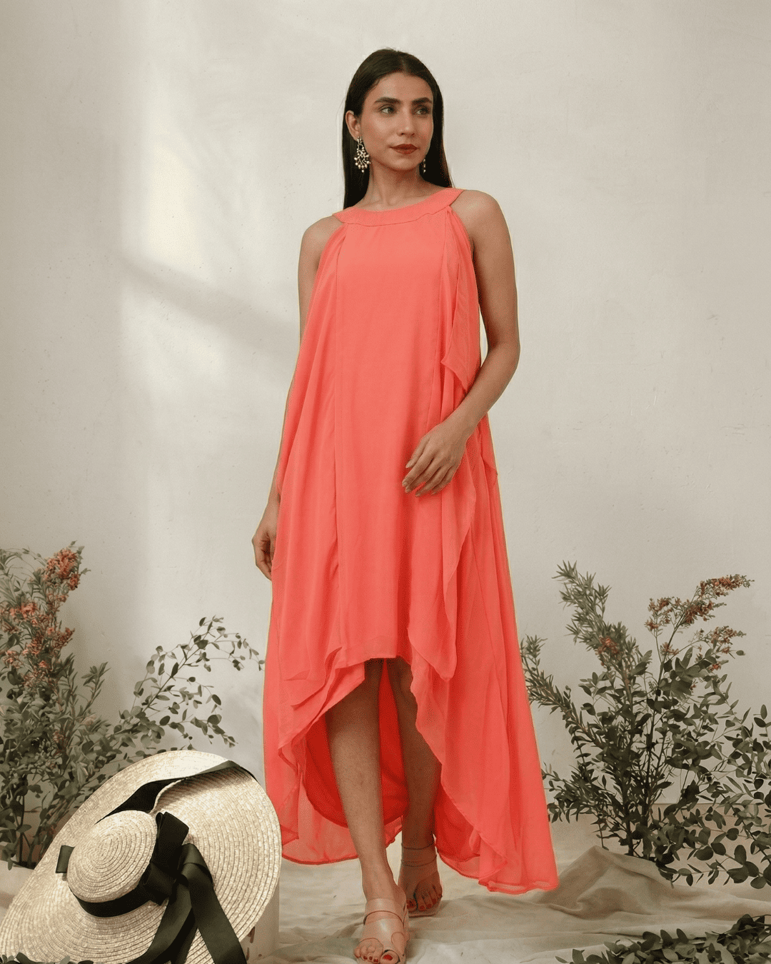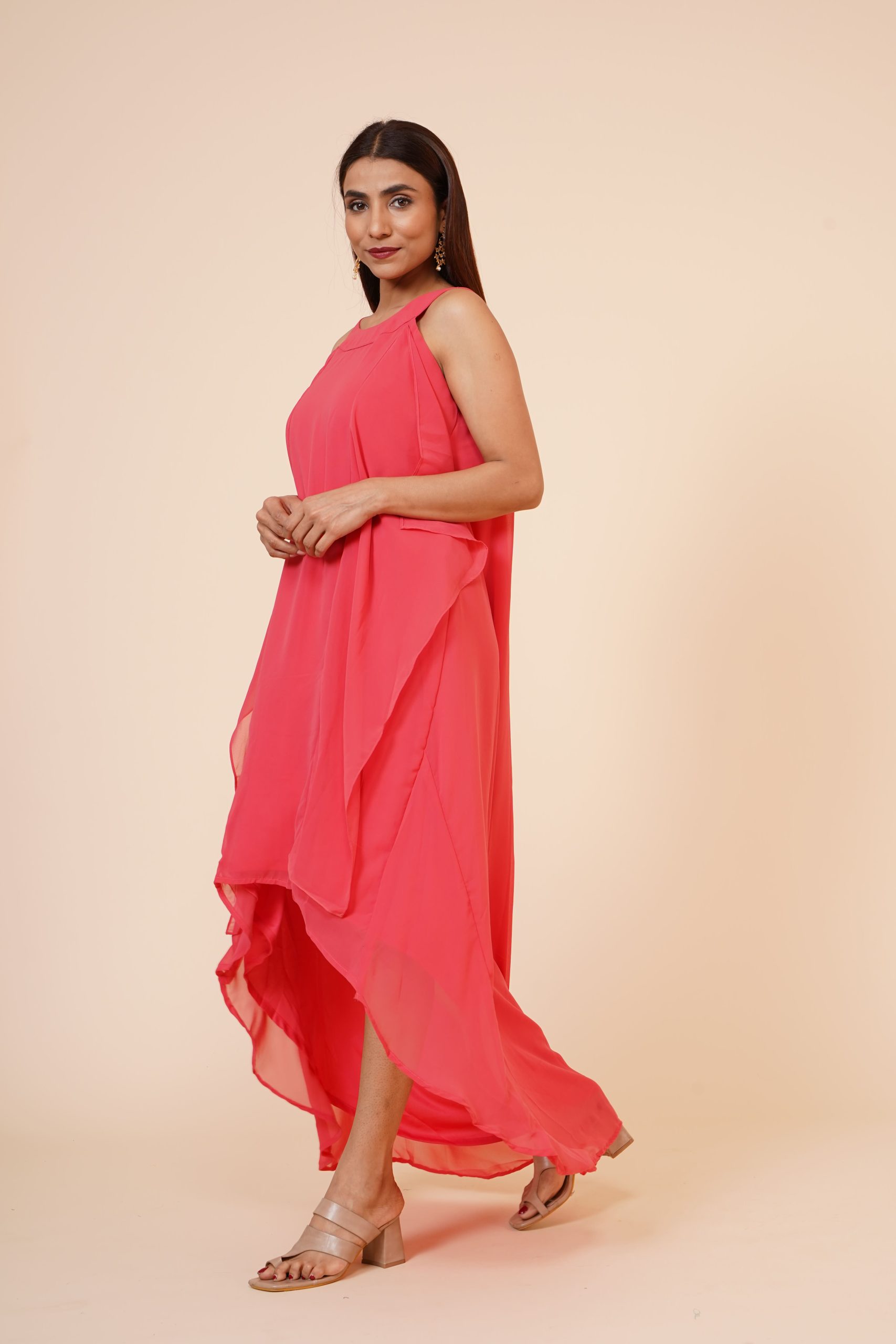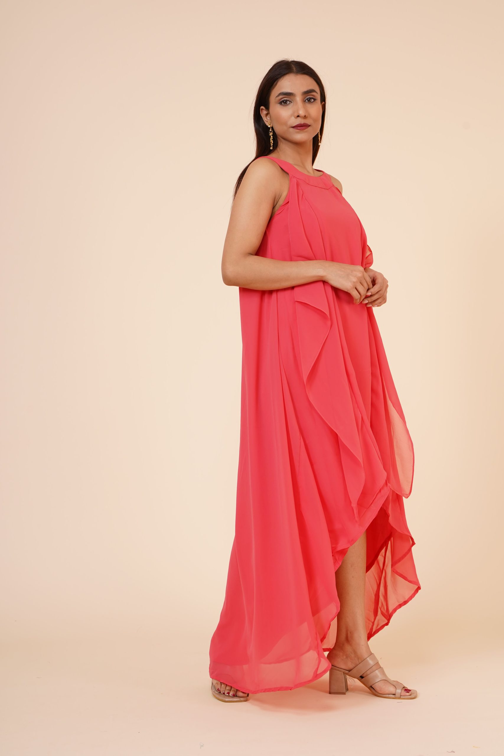 The Women’s Halter Neck Ruffle Georgette Party Dress in Peach stands out because of its warm, refreshing pigment and thoughtful structural design. The layered midi silhouette provides a sophisticated movement that catches the light, while the halter neck offers a timelessly chic neckline that elongates the frame. Peach has emerged as a top trend on international runways, often cited by experts at Vogue as a colour that symbolises warmth, joy, and modern elegance.