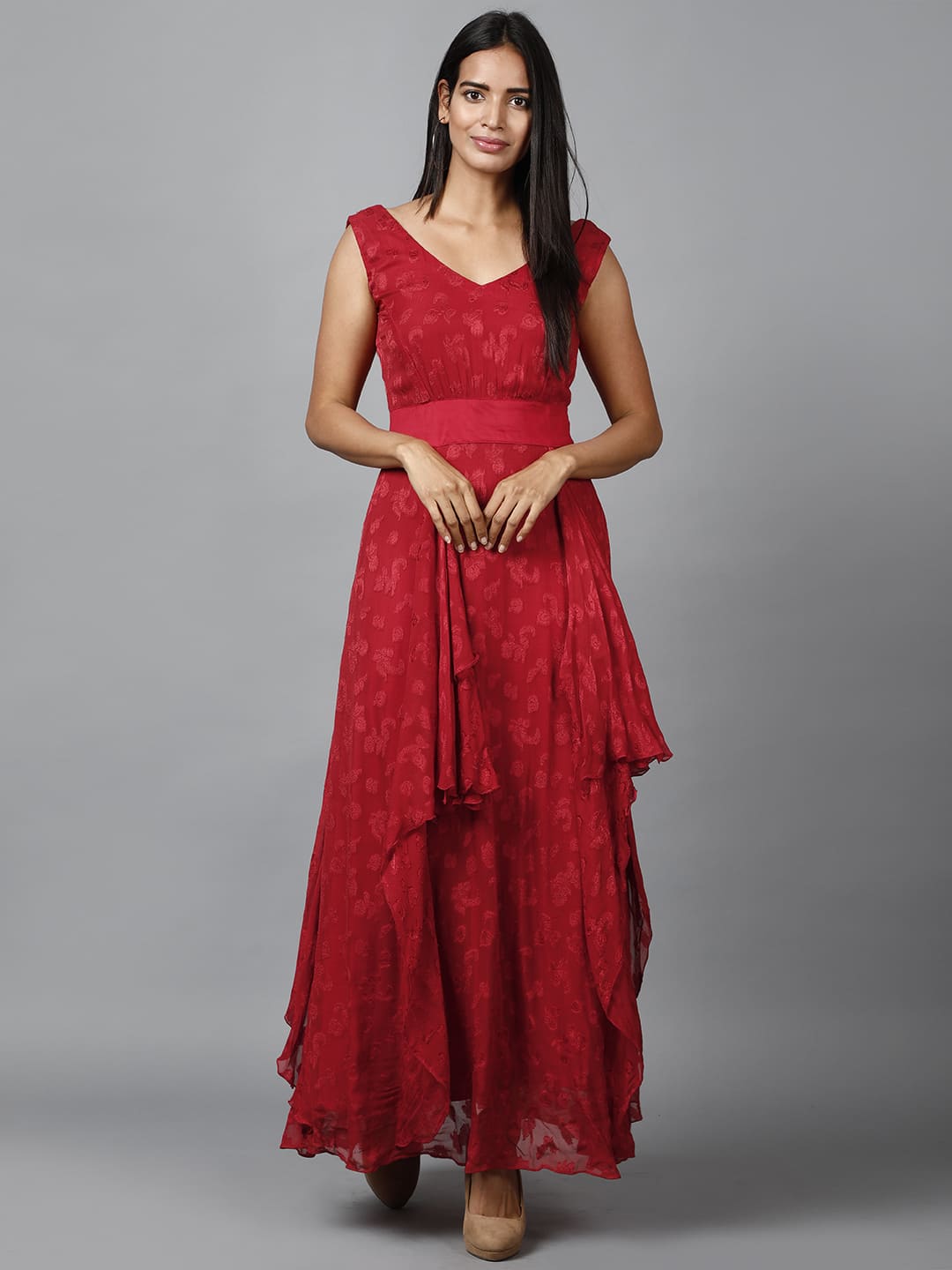 Investing in a Red floral self-design georgette drape dress is an investment in timeless style. The combination of the V-neck, square back, and flowing drapes ensures this piece won’t go out of style. It offers a “regular fit” that prioritizes comfort without sacrificing the high-fashion “drape” aesthetic.
