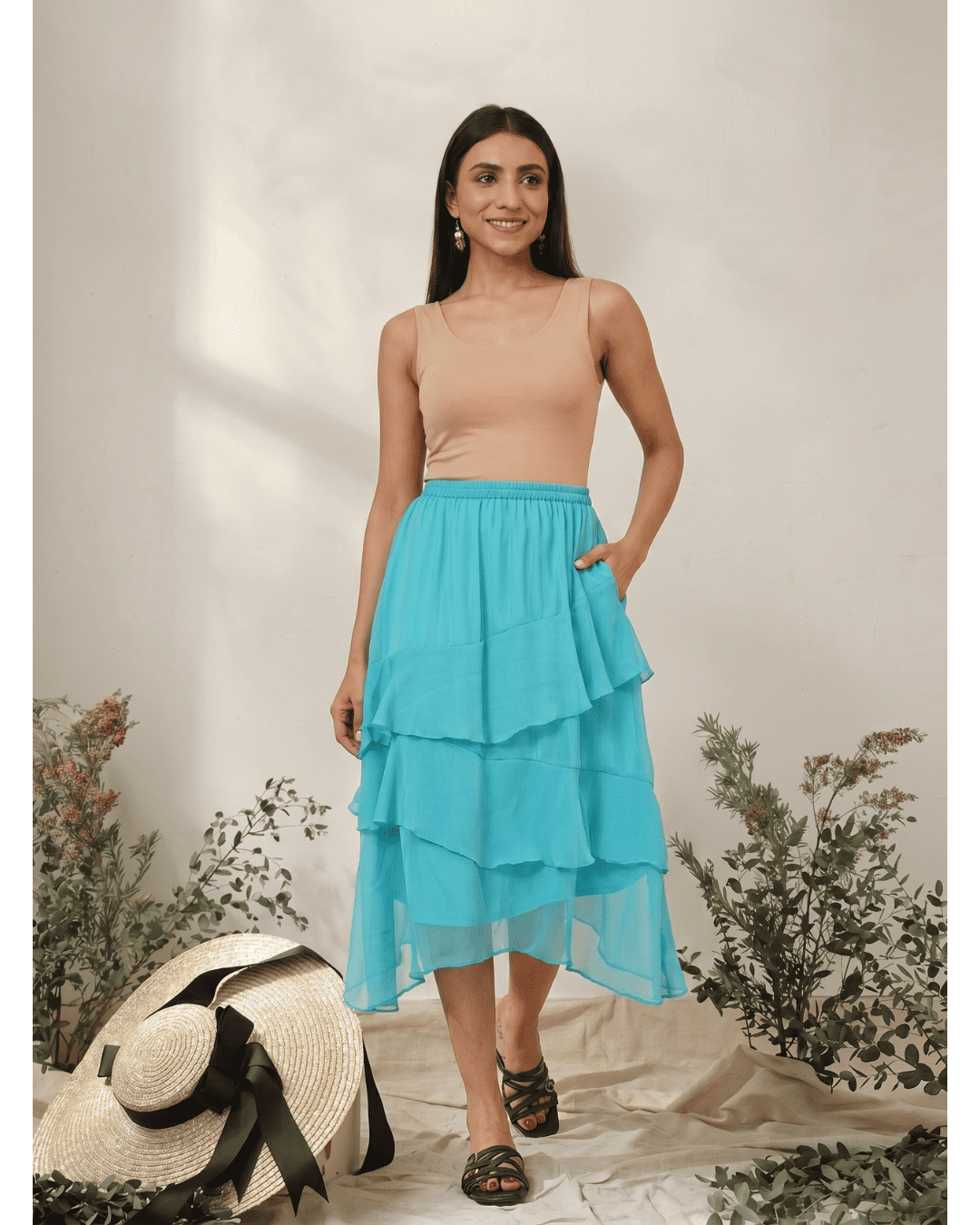 The versatility of the Sky Blue Chiffon Ruffle Skirt is one of its greatest strengths. Here are three ways to elevate your look: