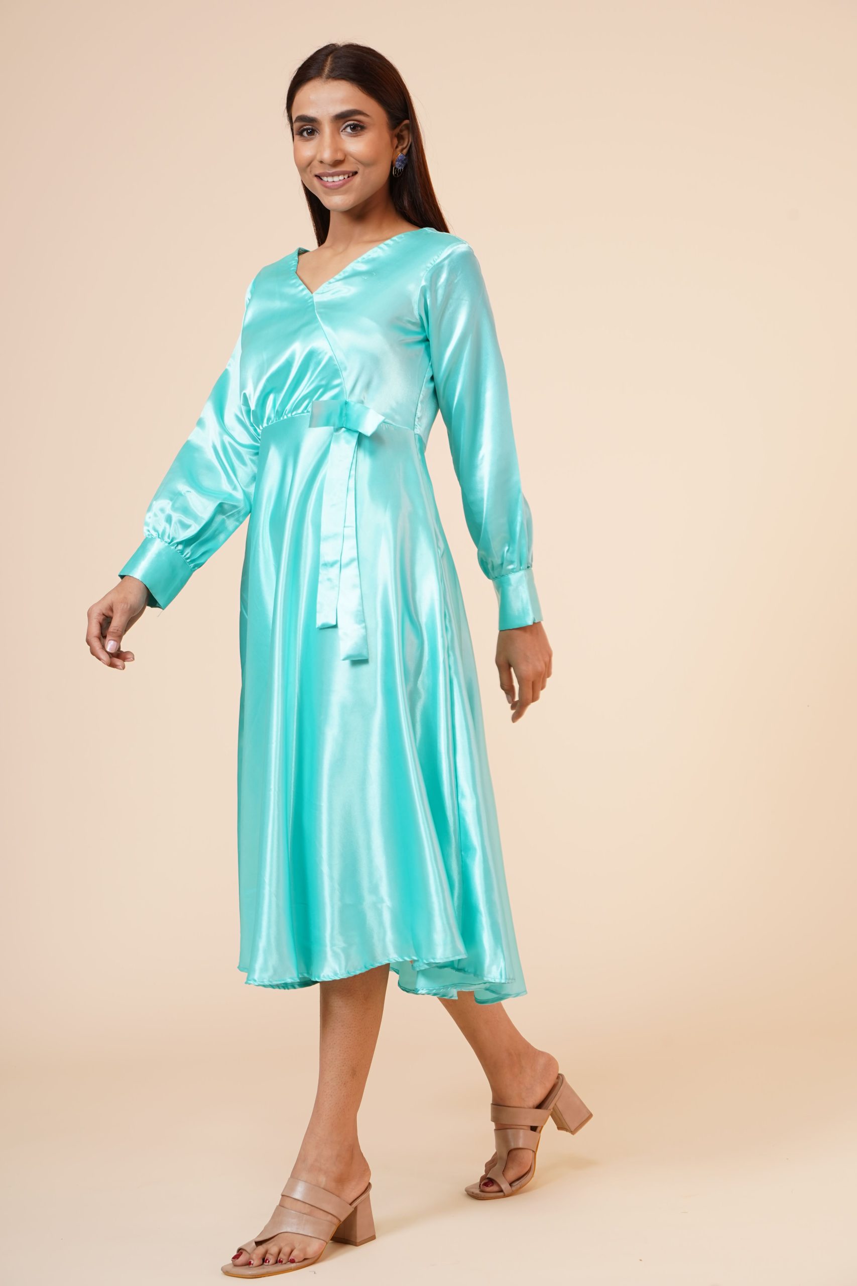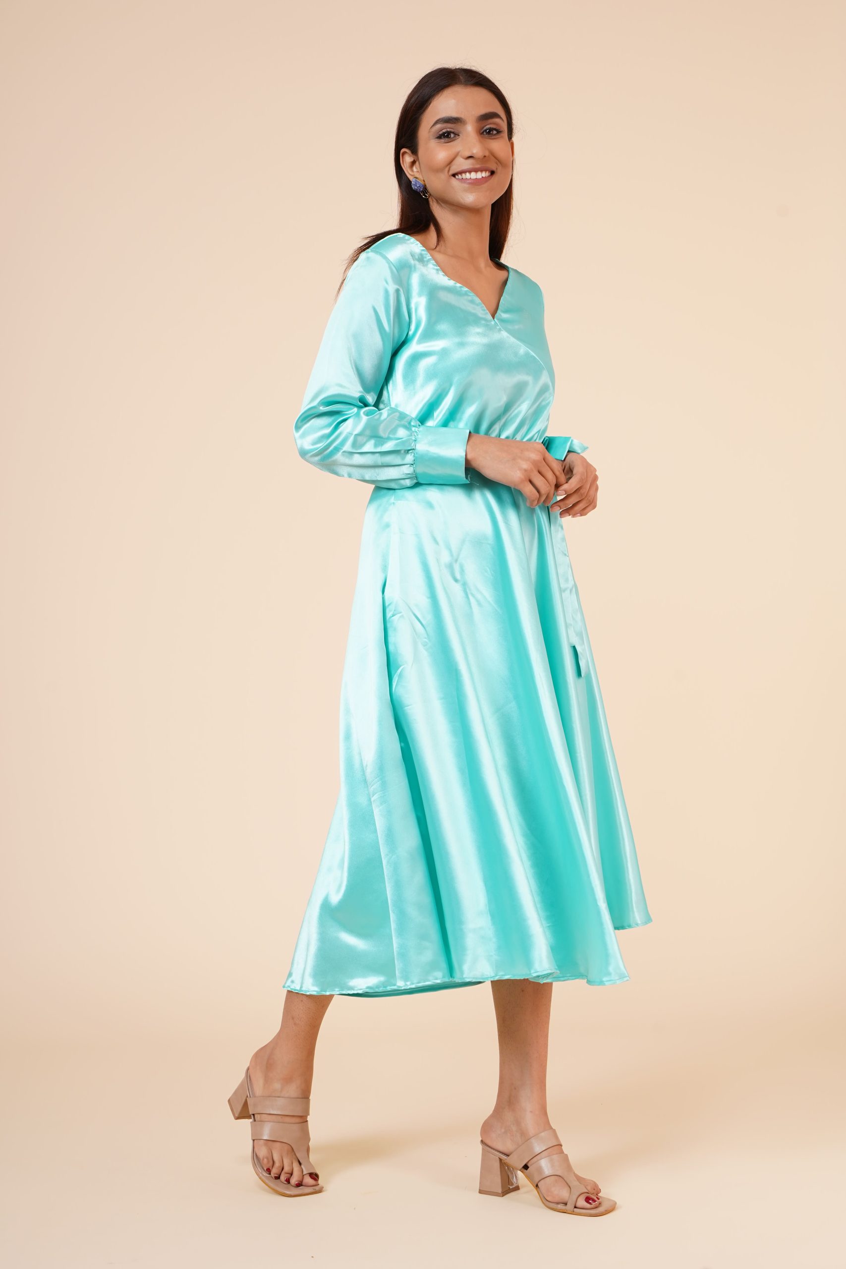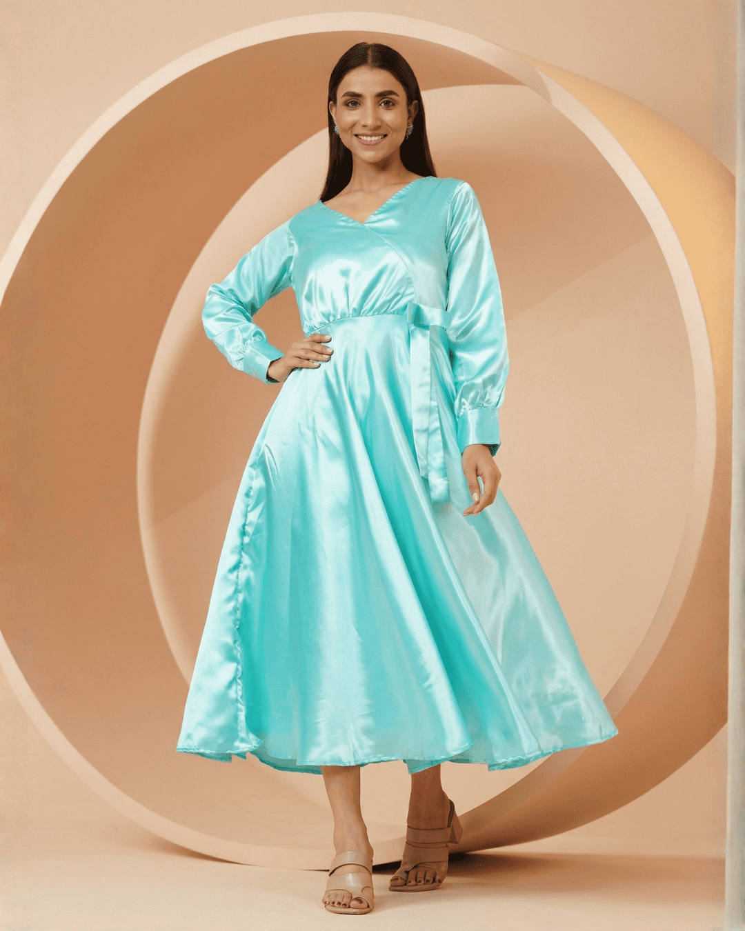 The Sky Blue Empire Line Satin Wrap Dress is a breath of fresh air for any wardrobe, combining the ethereal charm of a clear morning sky with the sophisticated structure of a modern Satin Wrap Dress. Crafted for the contemporary woman who refuses to compromise on comfort or style, this dress serves as a versatile masterpiece. Whether you are navigating a busy day at the office or attending an evening celebration, the soft glow of the sky-blue satin ensures you remain the focal point of every room.