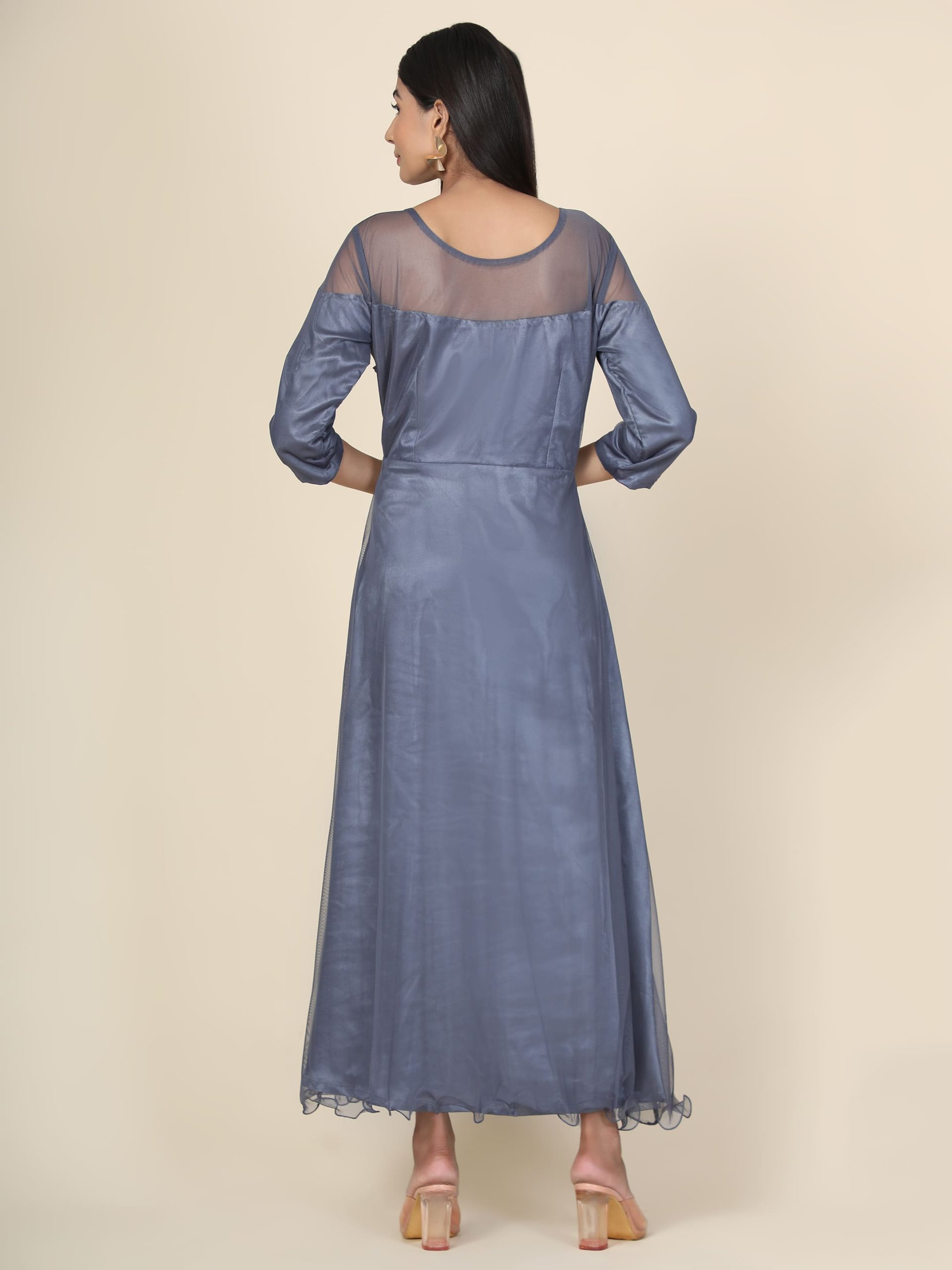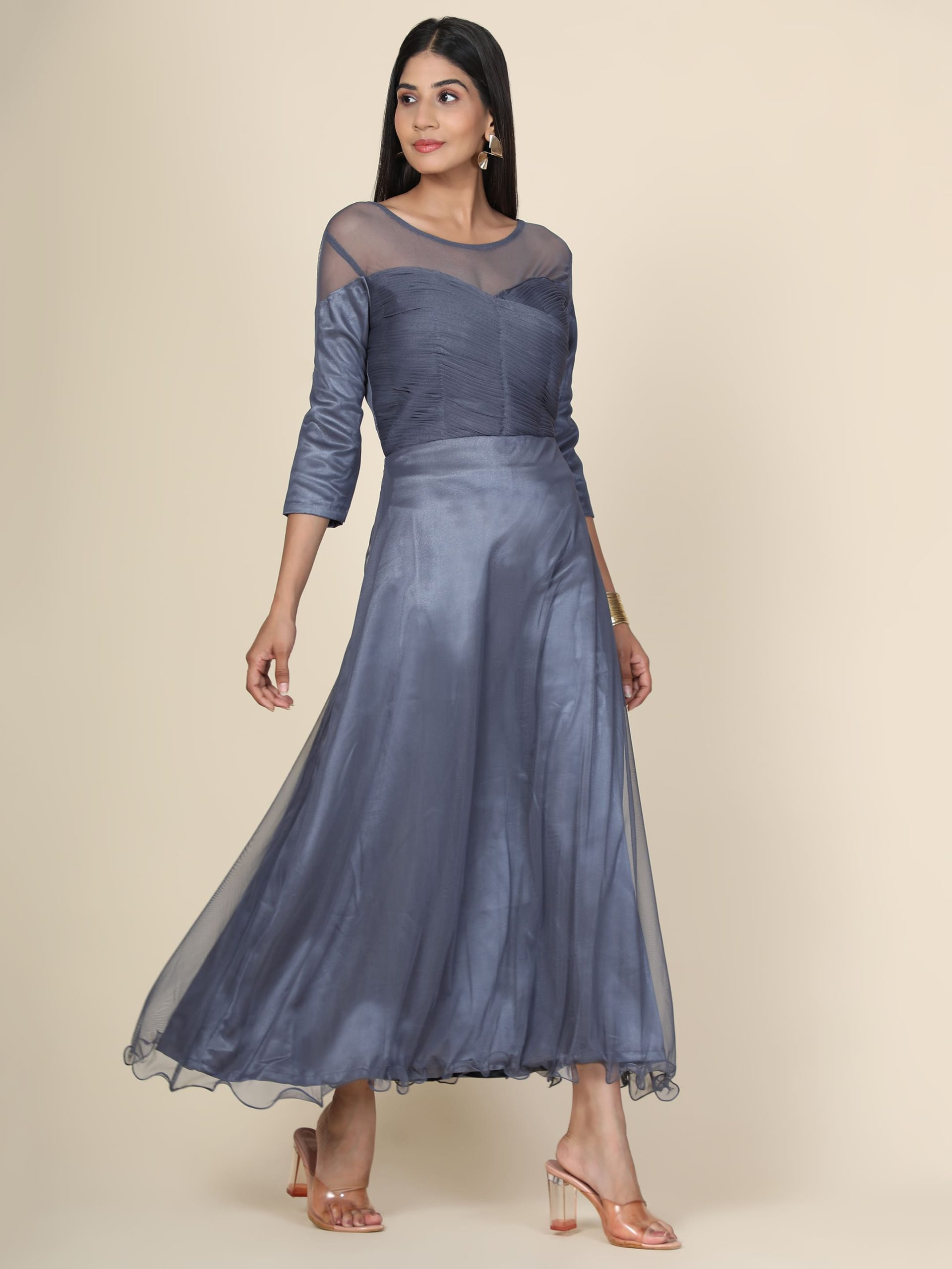 While it is titled a Grey Pleat Draped Gown, its utility extends far beyond just “parties.” Its regular fit and breathable net fabric make it an ideal choice for: