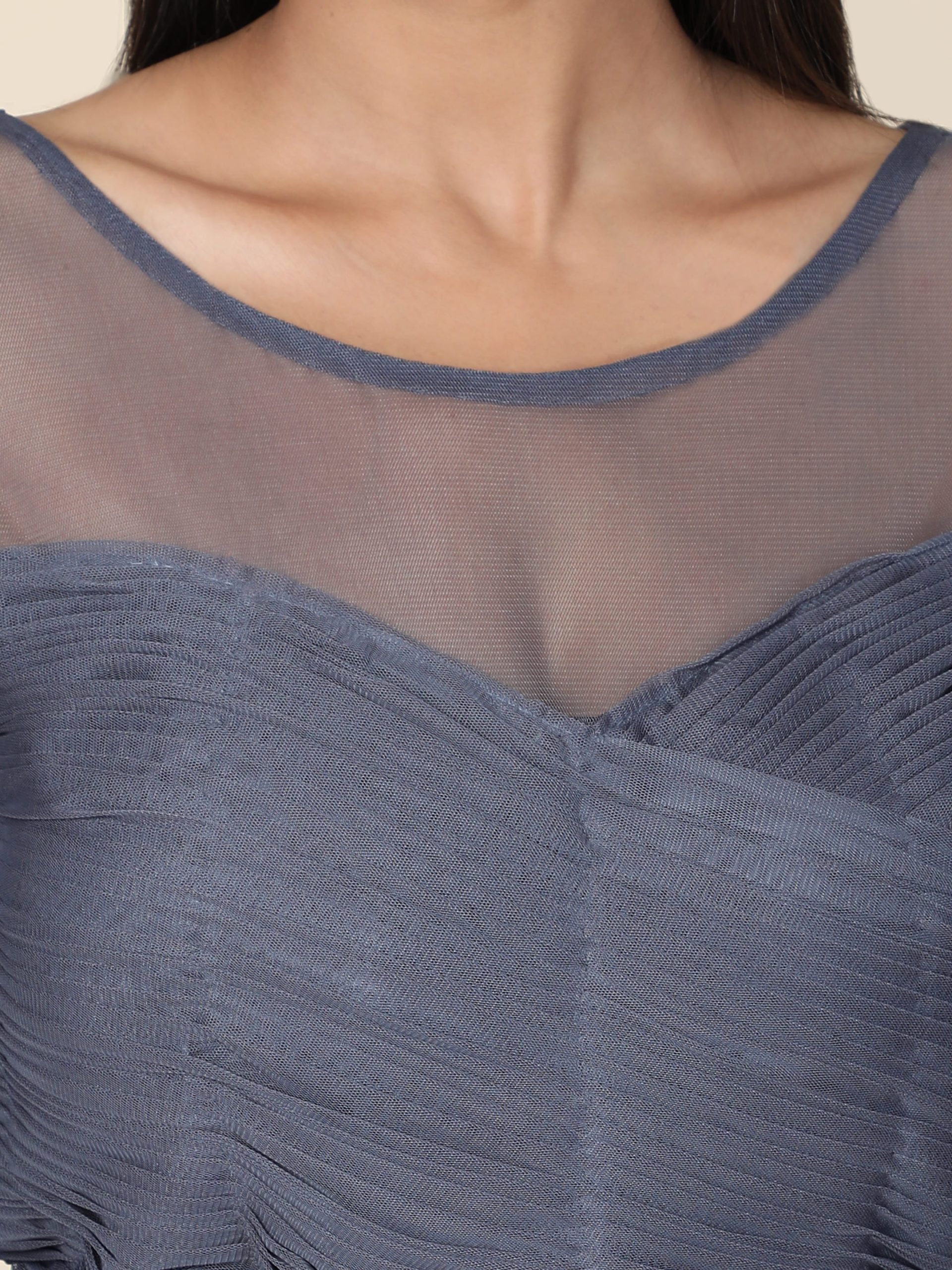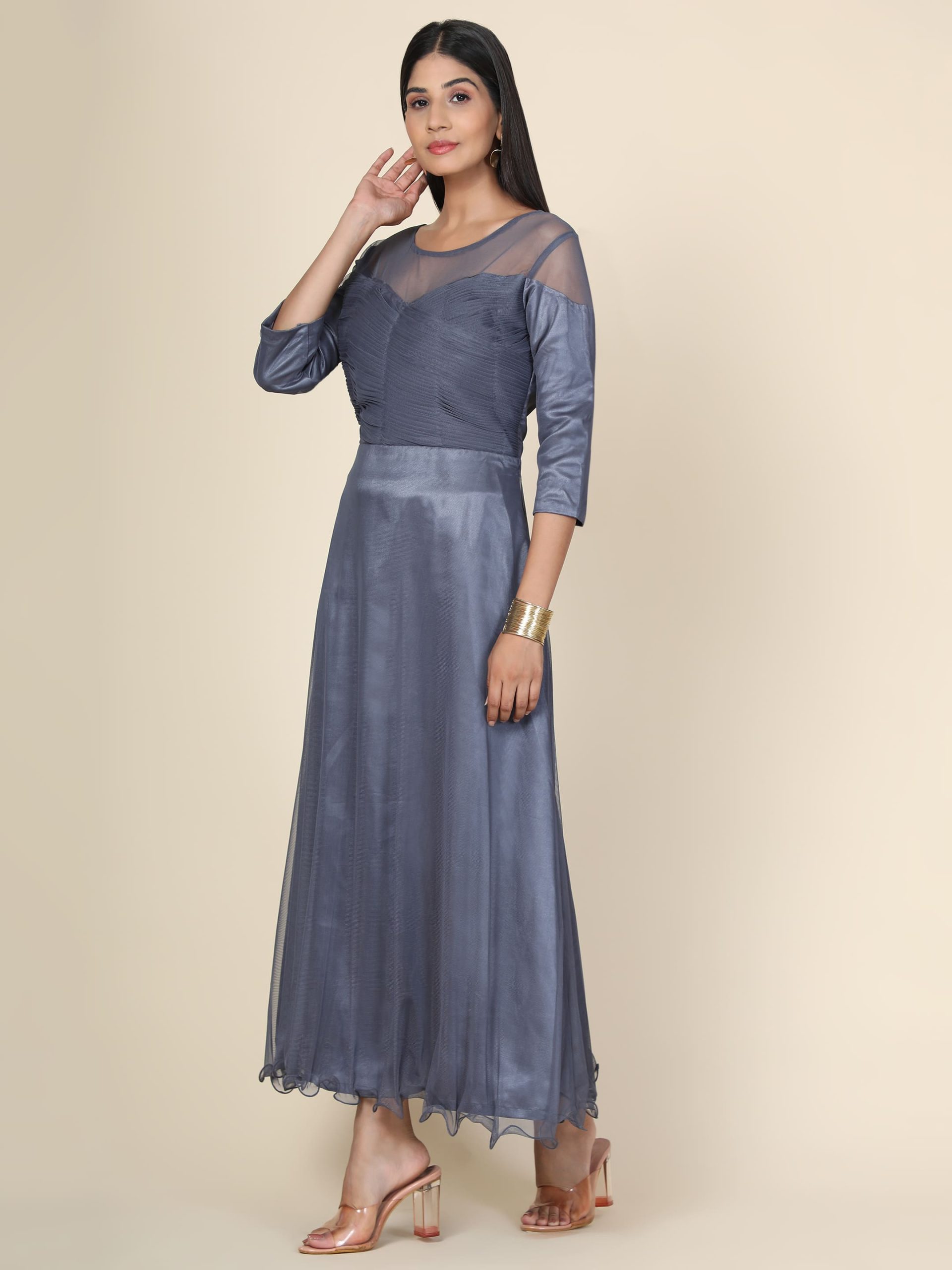 Satin and Net Fusion: The blend of these two fabrics in the Grey Pleat Draped Gown offers a multidimensional look that is soft to the touch and visually striking.