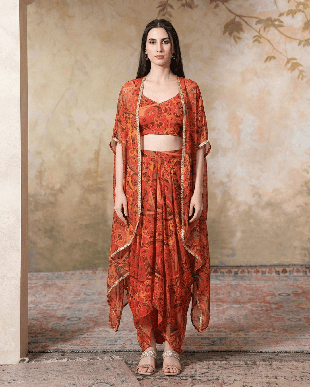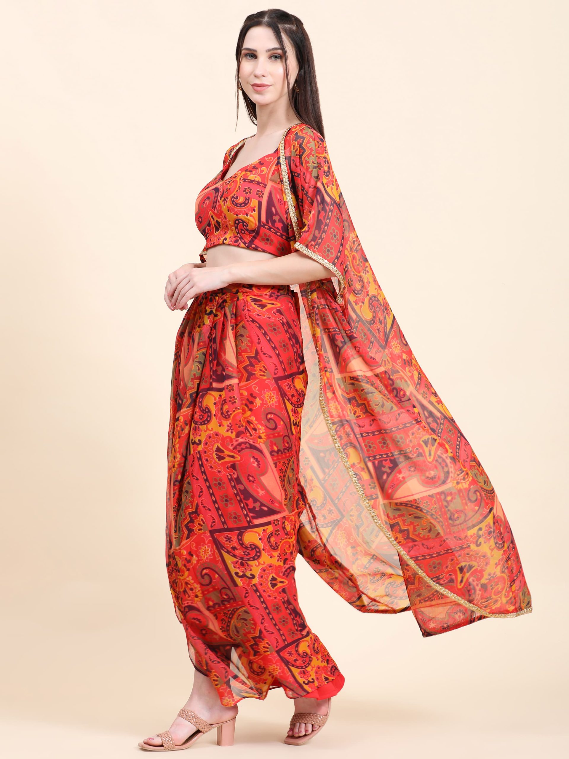 | Product Name | Multicolor Print Cape Blouse and Dhoti Drape Skirt Set |