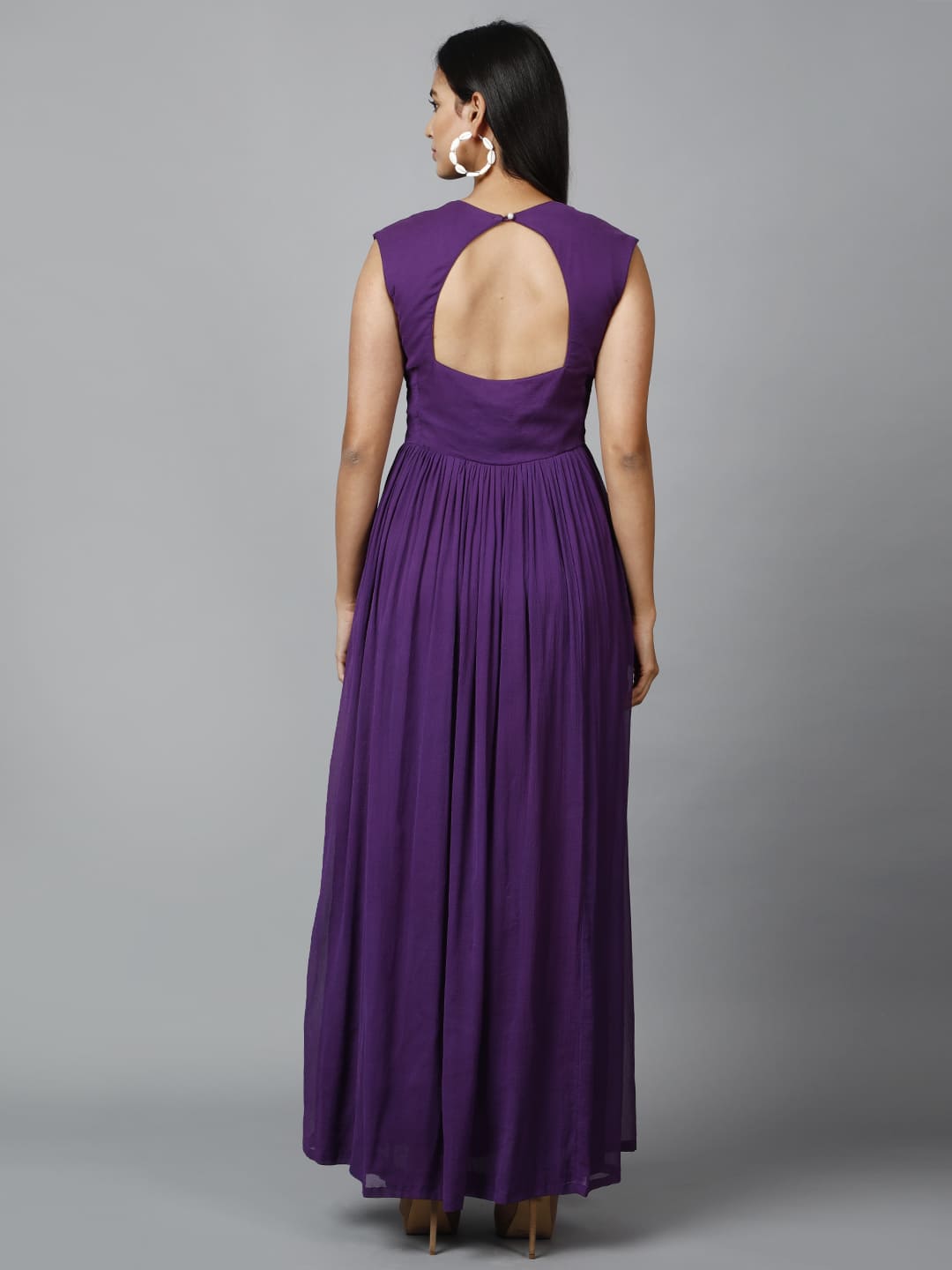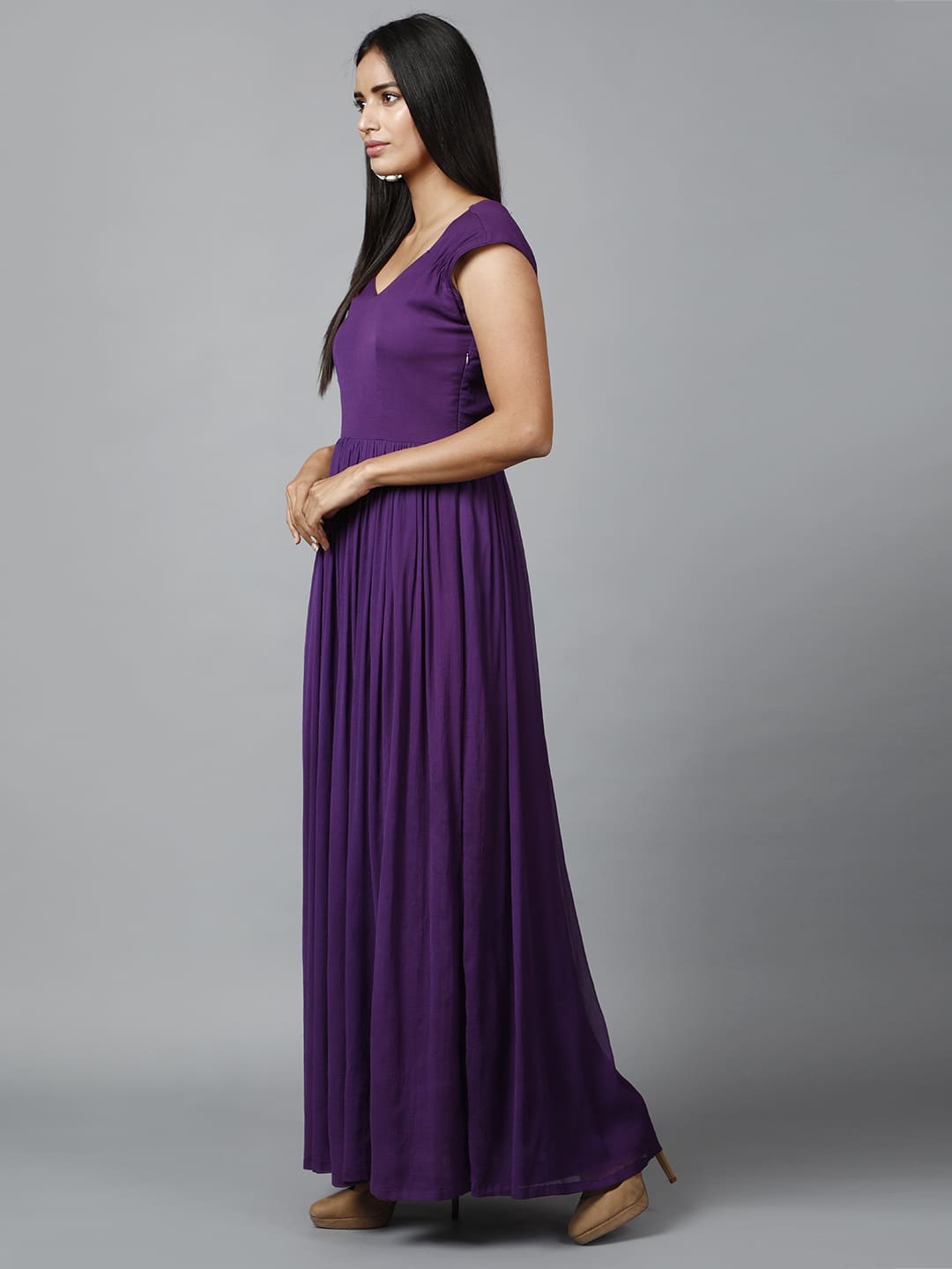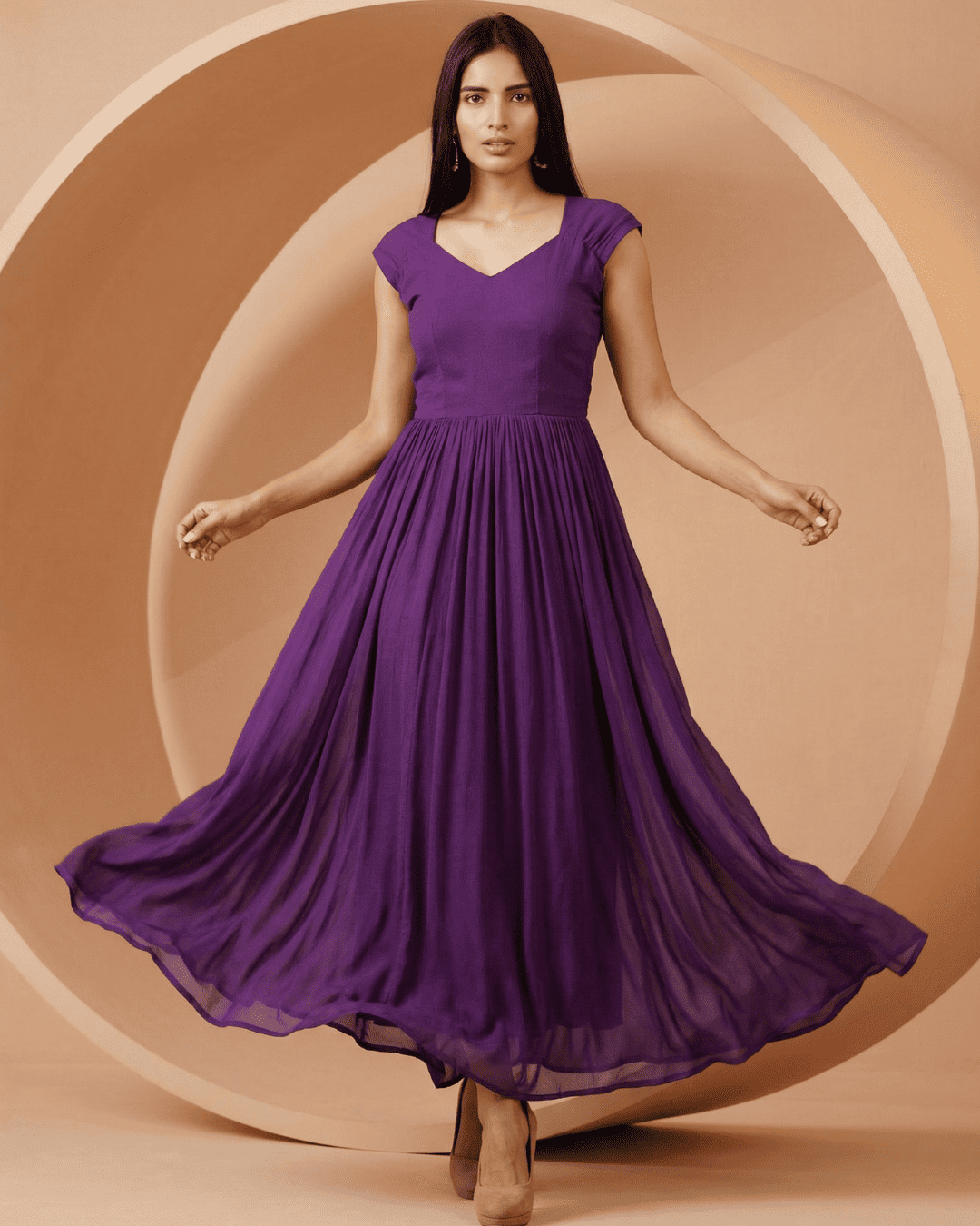 The Women’s Drape Chiffon Party Evening Gown in Purple stands out because of its rich, deep violet pigment and structural sophistication. The full-length A-line layered silhouette provides a sense of refined movement, while the stylish diamond neckline offers a unique, polished frame for your face. Purple has long been a favourite on international runways, often cited by experts at Harper’s Bazaar as the most versatile “power colour” for formal and festive evening wear.