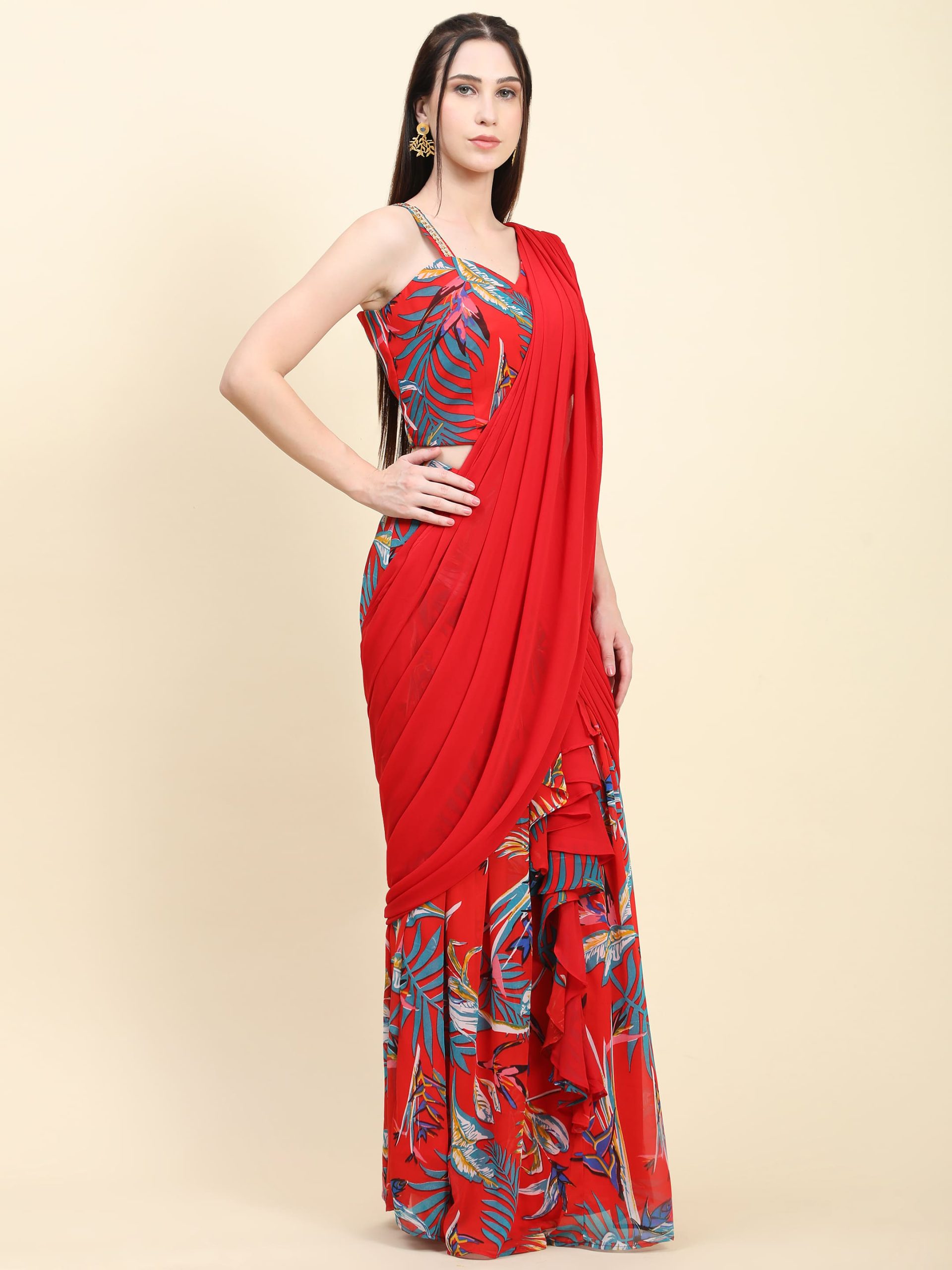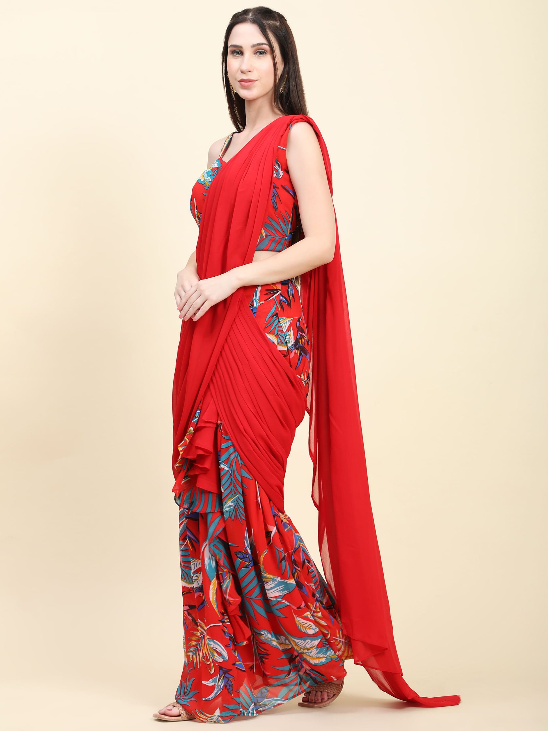 Finding the perfect balance between heritage and modern flair can be a challenge for any fashion enthusiast. However, the Leaf Print Pleated Pallu Saree with Ruffle Pleats, Drape Saree solves this dilemma by offering a pre-styled, high-fashion silhouette that takes the stress out of traditional draping.