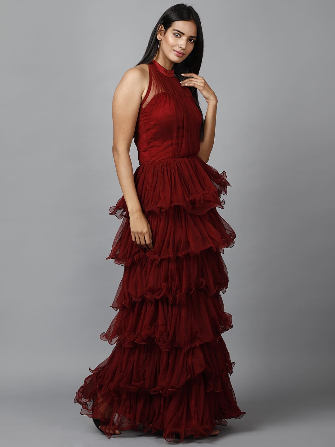 The allure of the Women’s Halter Neck Party Gown in Maroon lies in its “woven” work and the dramatic impact of its tiered silhouette. As a premier Women’s Halter Neck Party Gown in Maroon, this garment utilises a chic halter neck and multitier ruffle accents to create a visual flow that is both modern and timeless. Choosing a women’s halter neck party gown in maroon means investing in a gown that captures the essence of evening glamour. The Women’s Halter Neck Party Gown in Maroon is truly the ultimate choice for those seeking a graceful and eye-catching look.