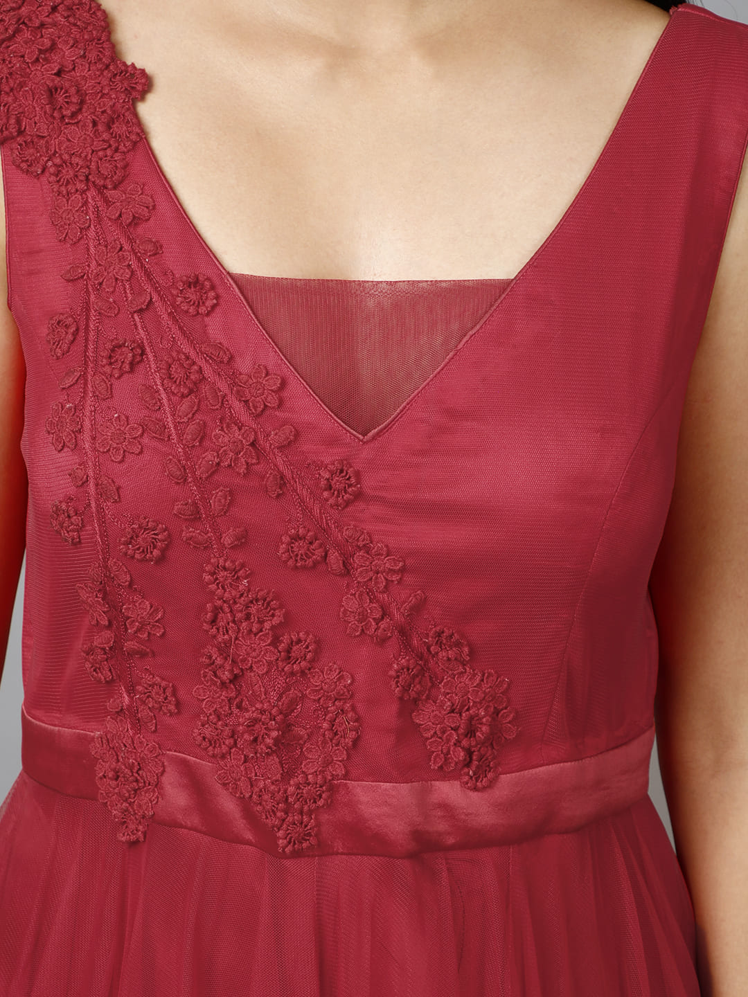 Key design elements of this Red Net Embroidered Bridesmaid Gown include: