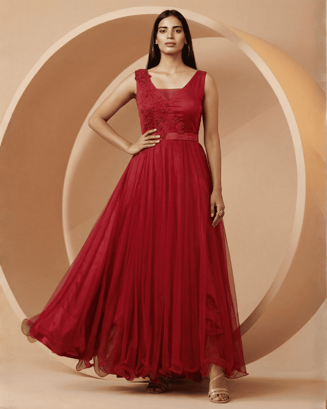 This silhouette is perfect for those who want to stand out with timeless elegance. For inspiration on how to style monochromatic red ensembles for grand occasions, check out the latest bridal and bridesmaid trends on Vogue India. If you are looking for a different texture for your next event, you might also be interested in our Red Georgette Leaf Print Ruffle Dress.