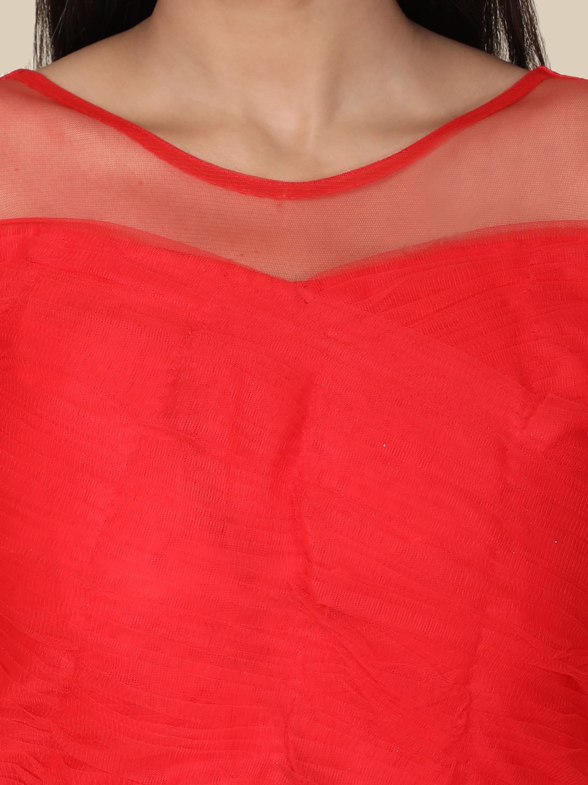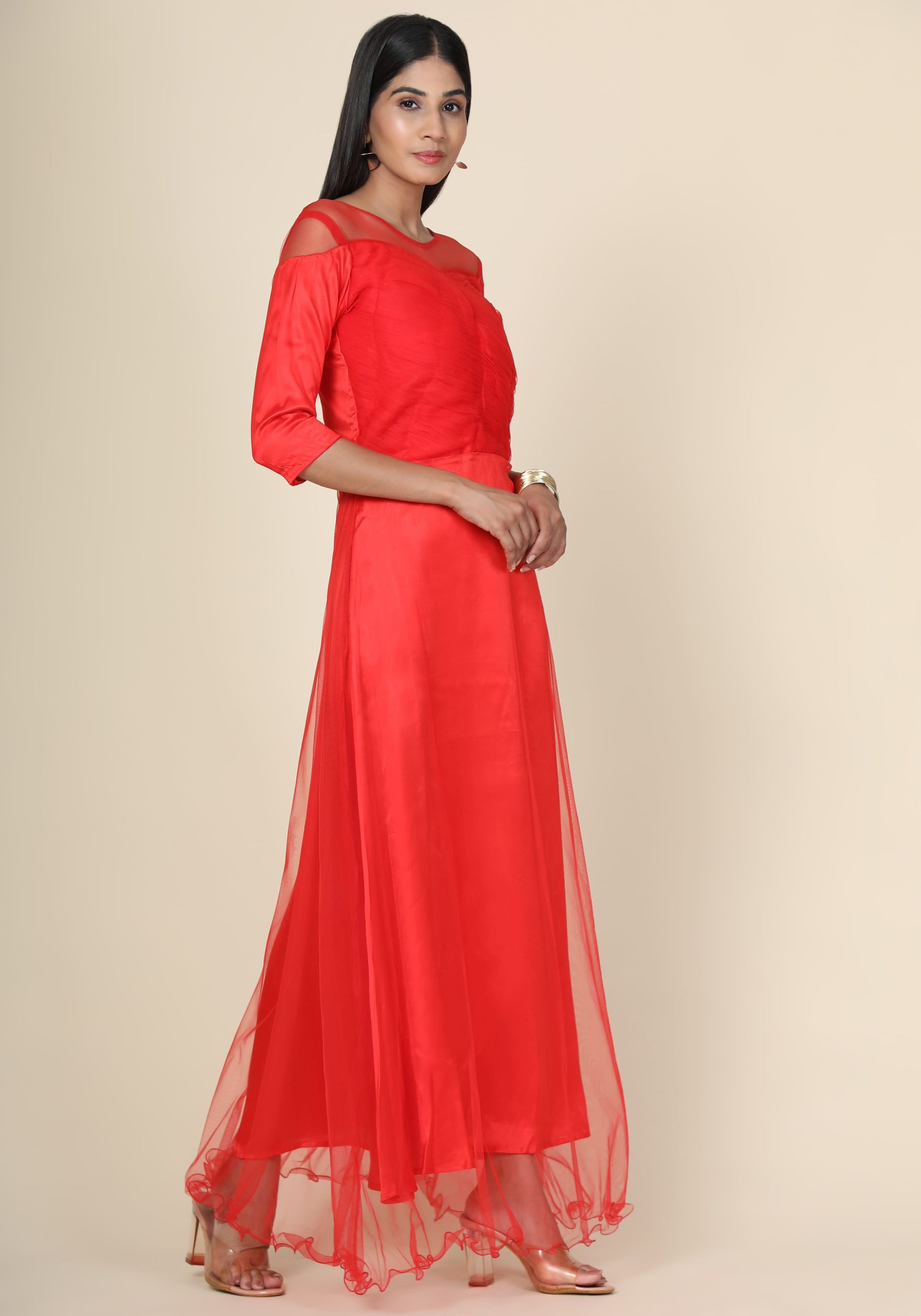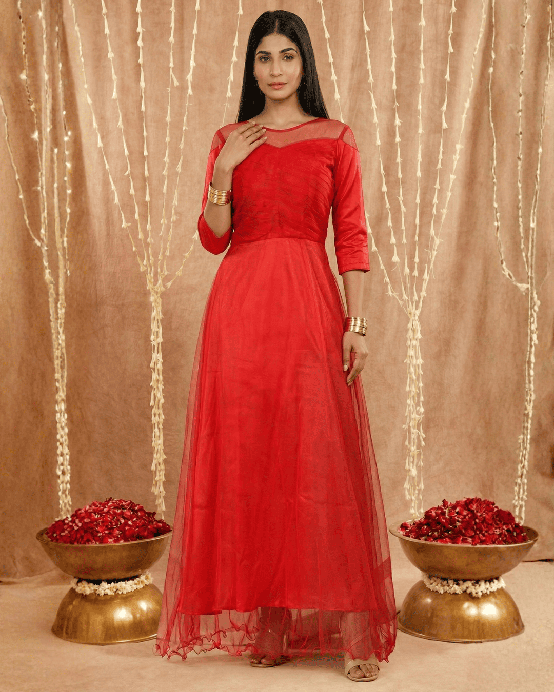 The Women’s Red Pleat Drape Gown, Drape Gown, and Ruching Gown stand out due to its unique fabric composition. By blending high-quality Net and Satin, designers have created a gown that offers structural integrity while remaining soft to the touch. The woven work adds a layer of depth and texture that is rarely found in standard ready-to-wear dresses.