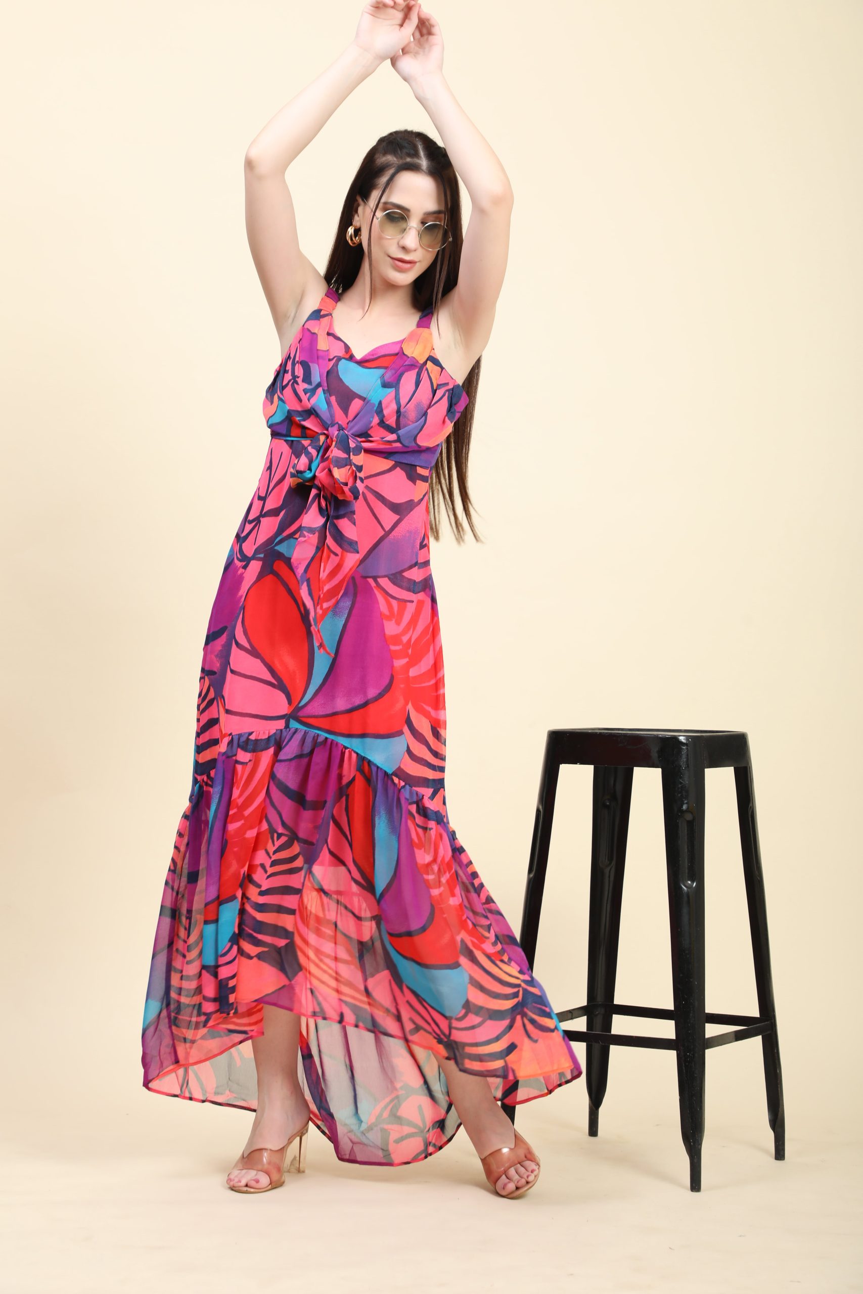 • This elegant pink-based, multicolour-print mermaid dress in a georgette base has a tie knot at the bust area.