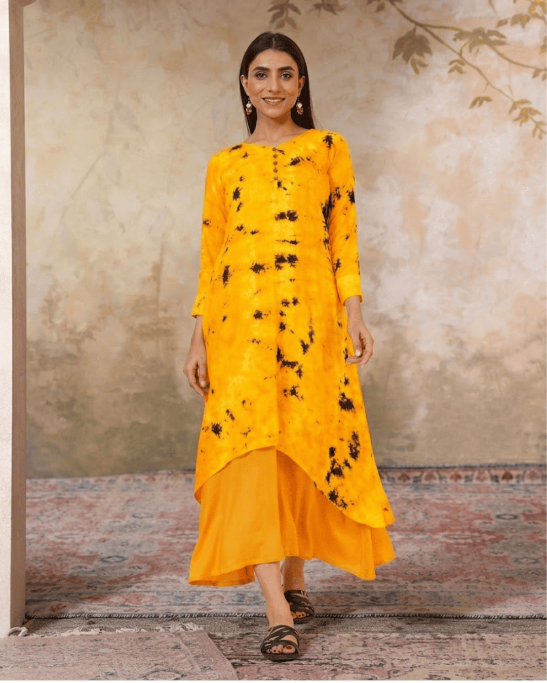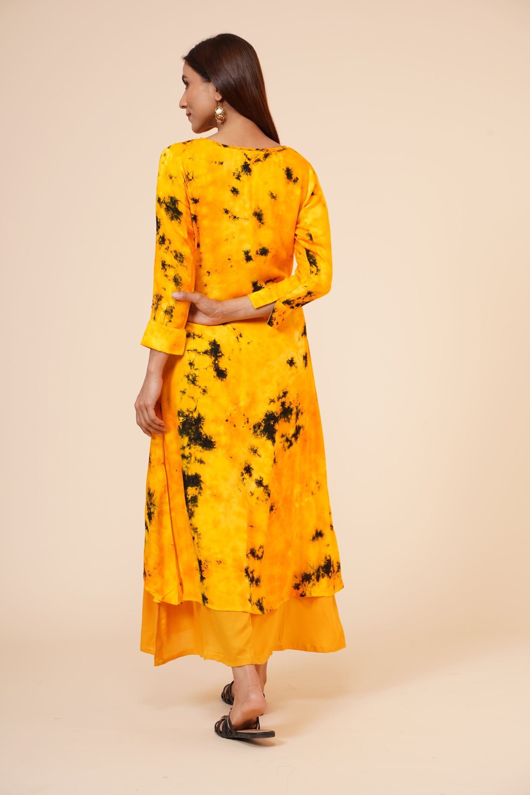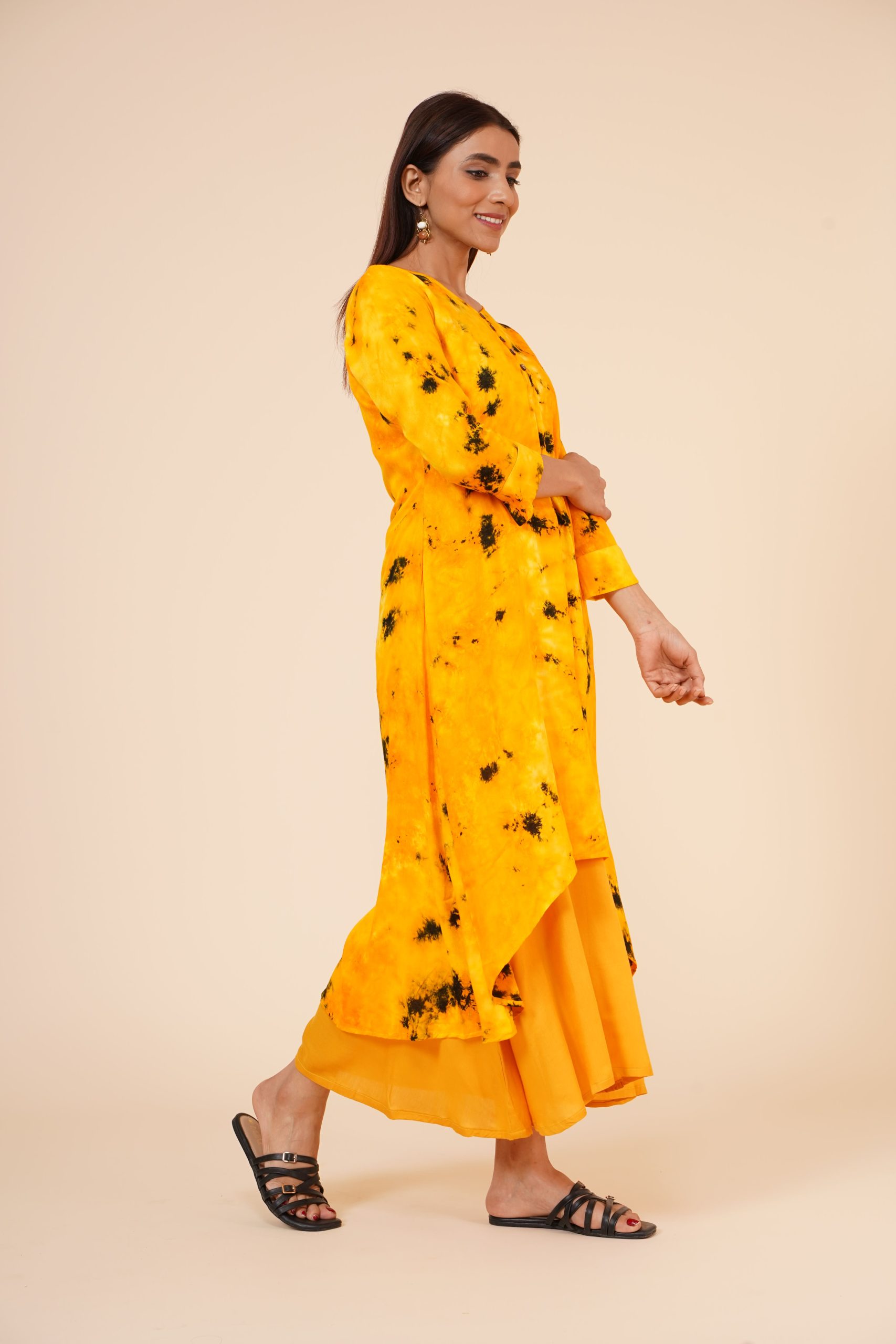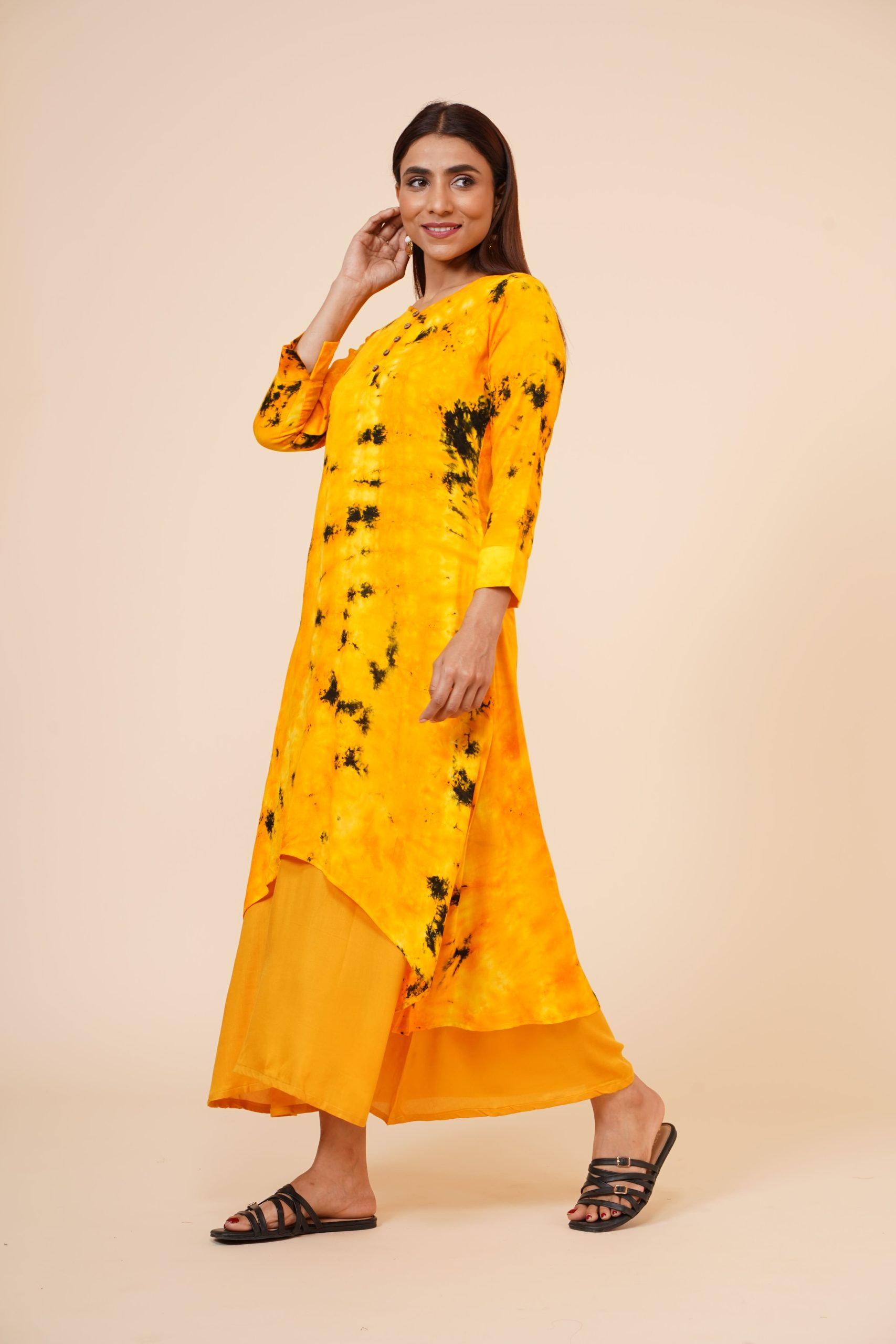 *Pattern : Kurti with wooden button placket at front, and Cuff *Color: Tie n Dye yellow mustard